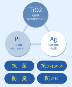 有機物を無機物に分解する触媒反応により、薬剤による耐性菌を発生させる恐れがなく、抗菌性を発揮するという全く新しい発想から生まれた製品です。